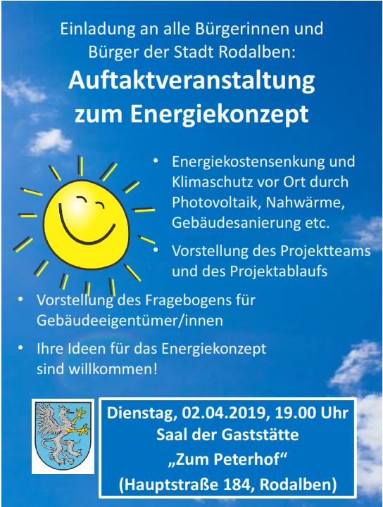 Die öffentliche Auftaktveranstaltung zum Energiekonzept findet am Dienstag, den 02.04.2019,19.00 Uhr im Saal der Gaststätte „Zum Peterhof“ (Hauptstraße 184, Rodalben) statt. Alle Bürgerinnen und Bürgersowie Interessierte sind eingeladen. Bei der Veranstaltung werden das Projektteam, der Projektablauf und der Fragebogen vorgestellt. Der ausgefüllte Fragebogen kann hier auch abgegeben werden.